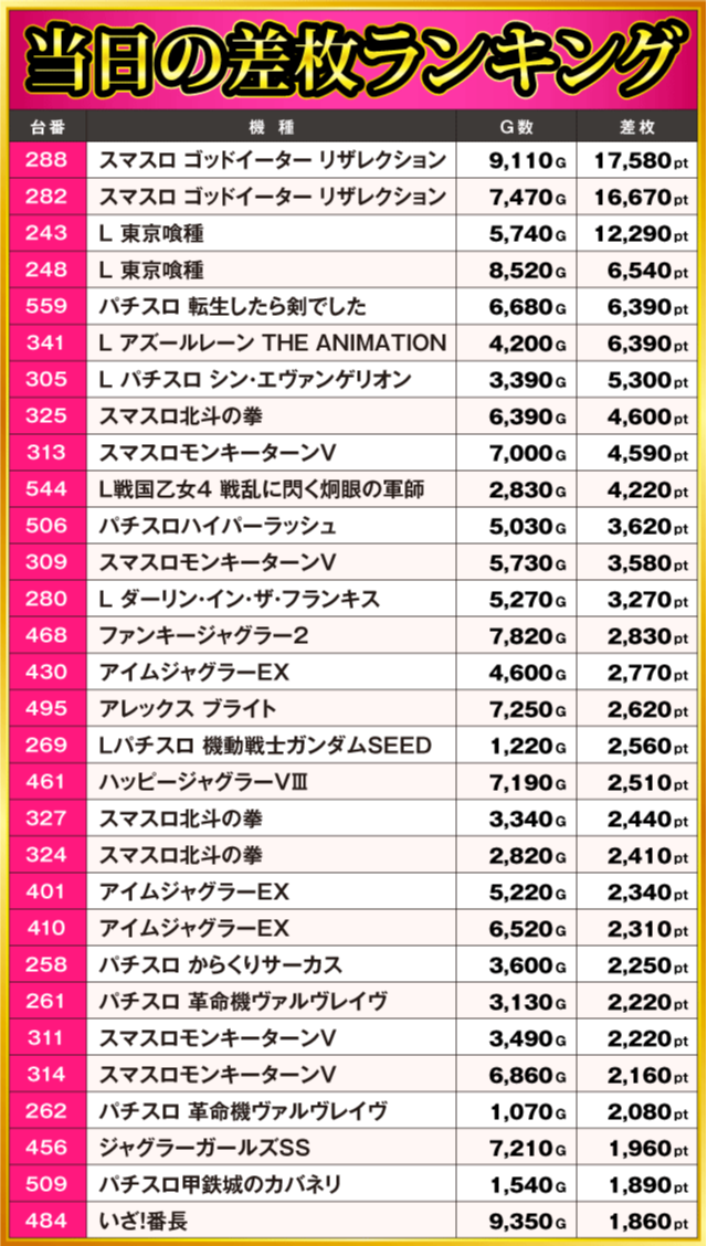 当日の差枚ランキング
