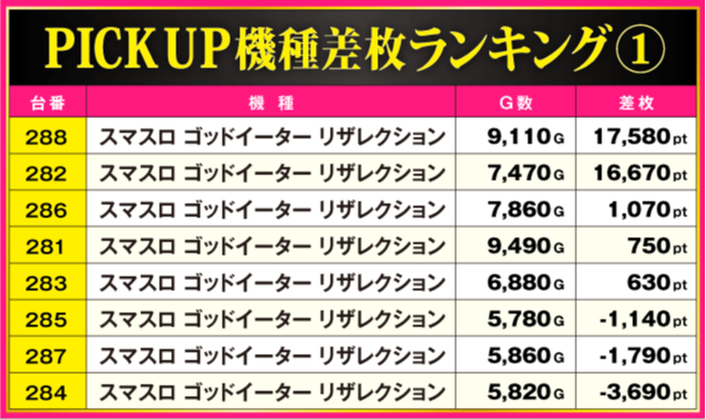 この日は、『スマスロ ゴッドイーター リザレクション』が+17,580ptに+16,670ptといった好成績を連発させプレイヤーの注目を集めていた。さらに、『L 東京喰種』からも+12,290ptが飛び出すなど、差枚TOP3が実にハイレベルな結果を残している。
