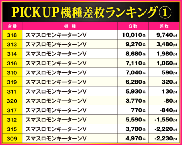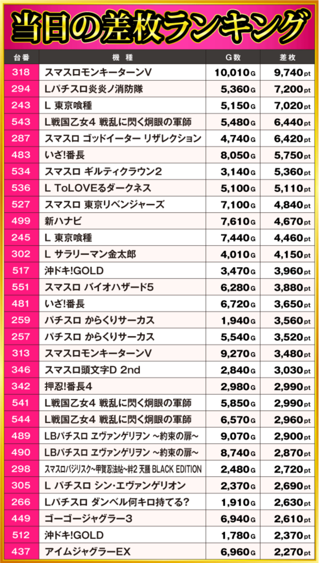 この日は、『スマスロモンキーターンV』が+9,740ptを叩き出しランキングトップに。次いで『Lパチスロ炎炎ノ消防隊』と『L 東京喰種』が+7,000pt超、『L戦国乙女4 戦乱に閃く炯眼の軍師』と『スマスロ ゴッドイーター リザレクション』が+6,000pt超を記録するなど、人気のスマスロを中心に多数の好調台が確認されている。