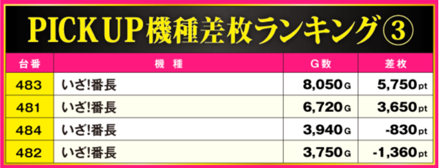 続いてPICK UP機種の状況を見ていこう。ハイスコアを記録した『スマスロモンキーターンV』と『L戦国乙女4 戦乱に閃く炯眼の軍師』以外に『いざ!番長』からも+5,750ptといった好成績が発生。それぞれのシマは常に活気に満ち溢れており、ファンにとって充実の一日となったのは間違いないだろう。