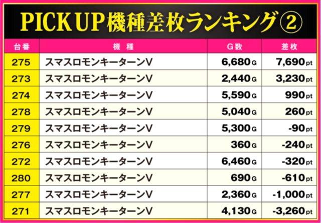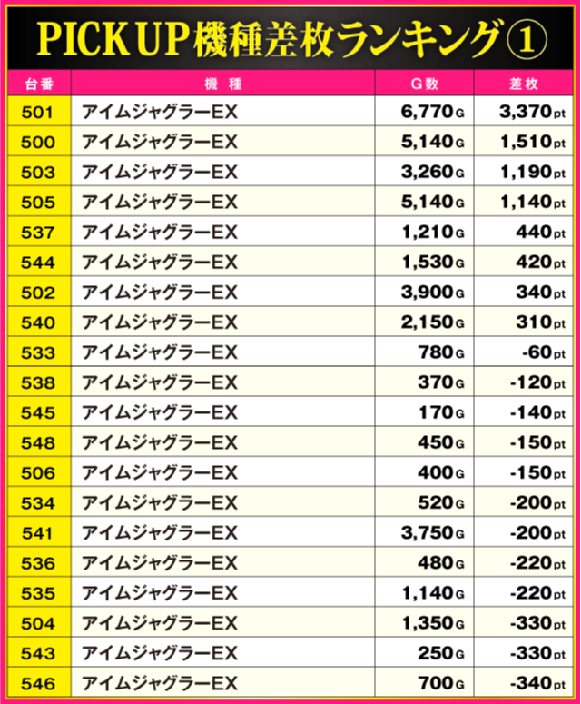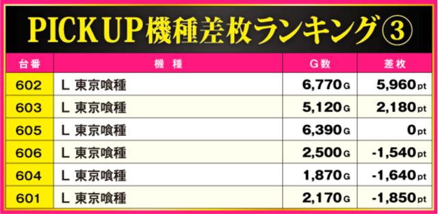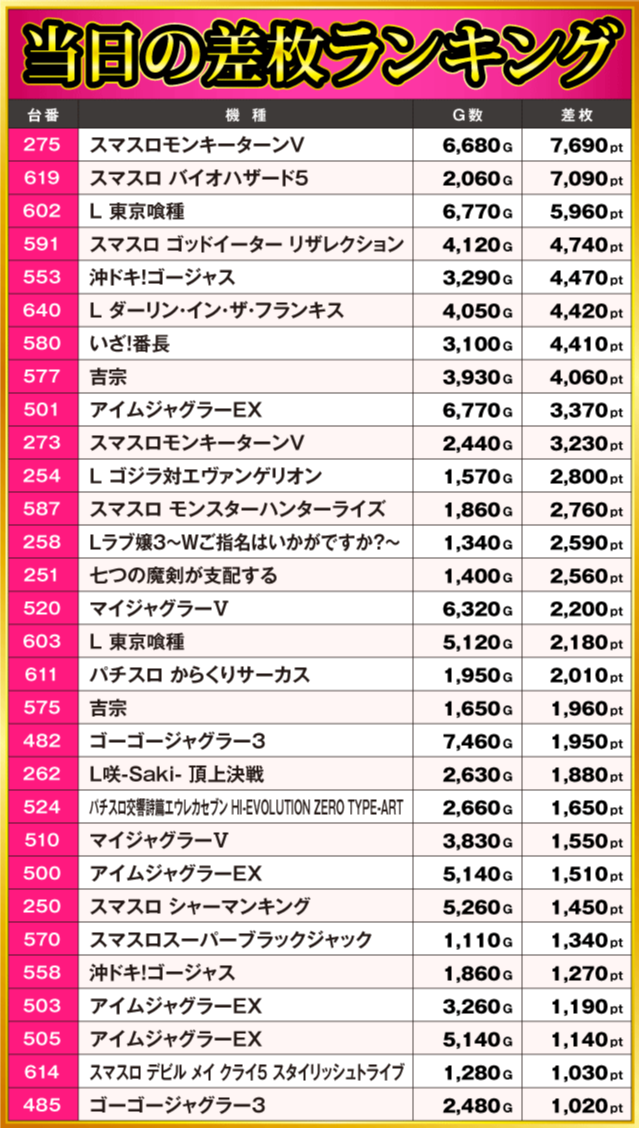 今回のPICK UP機種は全3機種で、ハイスコアを記録した『スマスロモンキーターンV』と『L 東京喰種』以外に『アイムジャグラーEX』からも多数の好調台を確認。501番台の+3,370ptを筆頭にプラス差枚台が続出しており、ファンにとって充実の一日となったのは間違いないだろう。