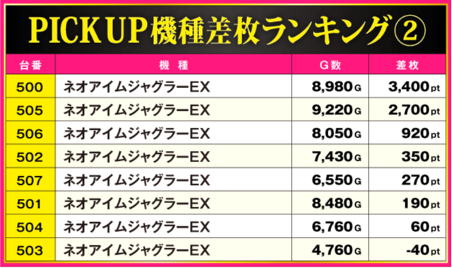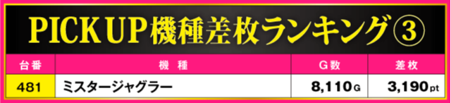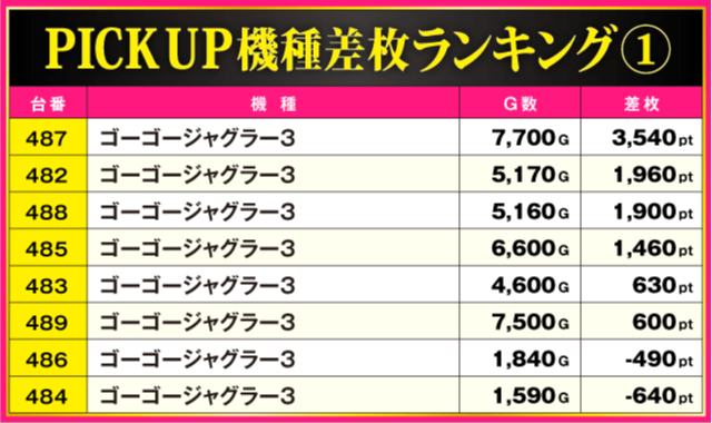 今回のPICK UP機種はジャグラーシリーズの3機種で、全ての機種で+3,000pt超を確認。しかも、3機種合わせた全17台中14台がプラス差枚で実戦を終える圧倒的な安定感を披露しているだけに、ファンにとって充実の一日となったのは間違いないだろう。