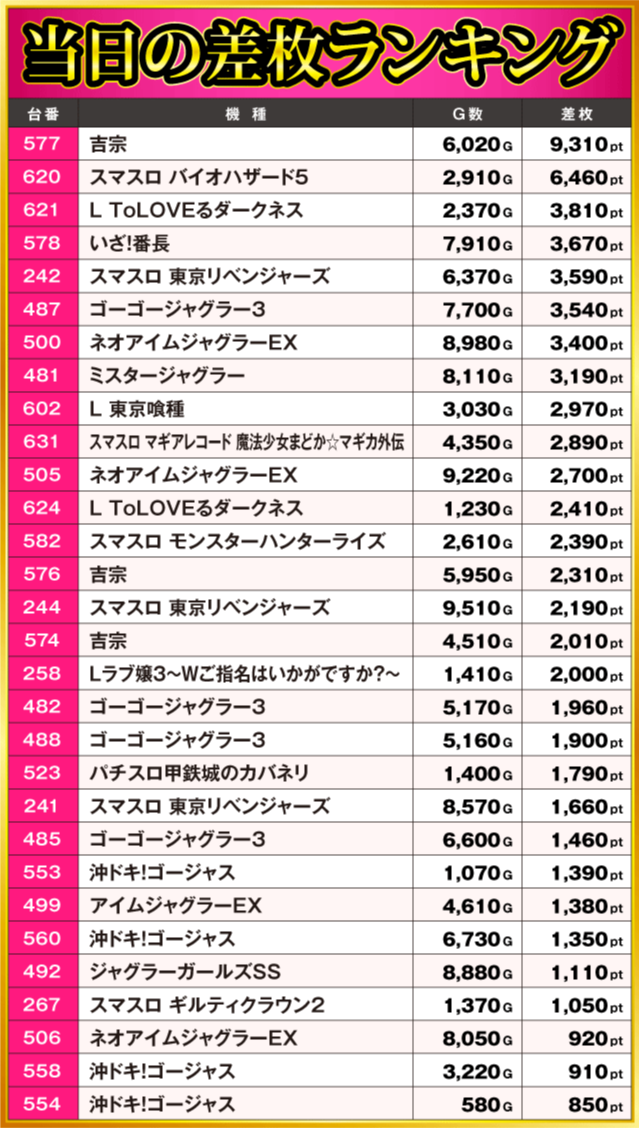 この日、最もプレイヤーの注目を集めたのが『吉宗』で、577番台が万枚目前の+9,310ptを叩き出ししランキングトップに輝いている。次いで『スマスロ バイオハザード5』が+6,460ptを記録。さらに、その他にも人気機種を中心に様々な機種から+3,000pt超が飛び出し店内を盛り上げていた。
