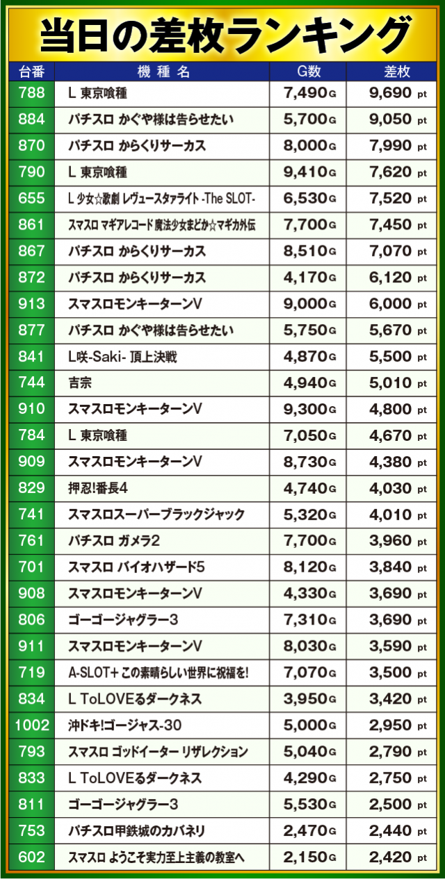 ※差枚数順に掲載しています