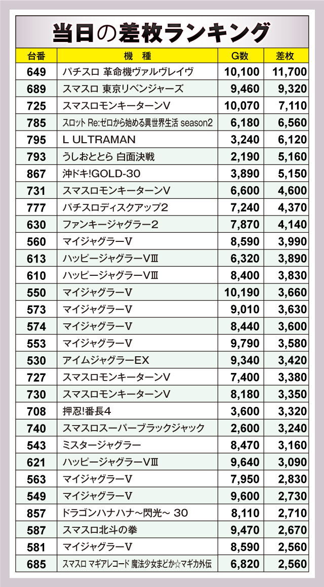 この日、最もプレイヤーの注目を集めたのが、未だ人気の衰え知らずな『パチスロ 革命機ヴァルヴレイヴ』で、649番台が+11,700枚を叩き出しランキングトップに。次いで、導入間もない新台の『スマスロ 東京リベンジャーズ』が万枚目前の+9,320枚を記録するなど、新旧を問わず様々な機種からハイスコアが確認されている。