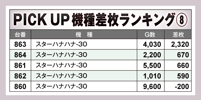 続いてPICK UP機種の状況をチェック!! 4つのジャグラーシリーズの中で特に目立っていたのが『マイジャグラーⅤ』で+3,000枚超が5台も発生する盛況ぶりを披露している。また、ハナハナシリーズも両機種合わせた全10台中8台がプラス差枚となる見事な結果に。さらに、『スマスロ北斗の拳』と『スマスロモンキーターンV』からも好成績が続出し店内を盛り上げていた。