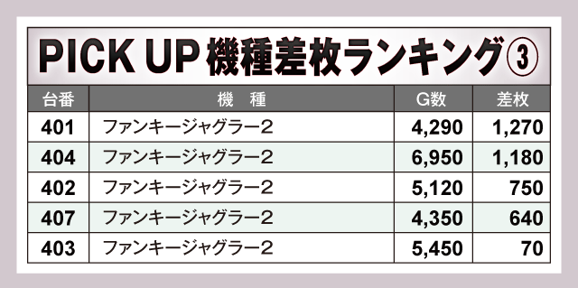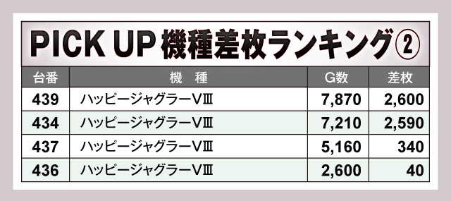 今回のPICK UP機種は全てジャグラーシリーズで、『マイジャグラーⅤ』の+3,010枚を皮切りに多数の好調台を確認。最終的に4機種合わせた全55台のうち半数以上の30台がプラス差枚となっているだけに、それぞれのシマは終日大盛況。ファンにとって充実の一日となったのは間違いないだろう。