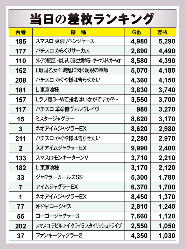 当日のランキング上位には、華々しい記録がずらりと並んだ。「スマスロ 東京リベンジャーズ」が+5,290枚という圧巻の結果でトップを飾ると、「パチスロ からくりサーカス」や「クレアの秘宝伝 〜はじまりの扉と太陽の石〜 ボーナストリガーver.」も+4,000枚超えで続き、凄まじい熱気を放つ。その他にもスマスロ、人気AT機、そしてジャグラーシリーズと、多彩な機種がランクインし、店内全体がチャンスに満ち溢れていたことを証明した。