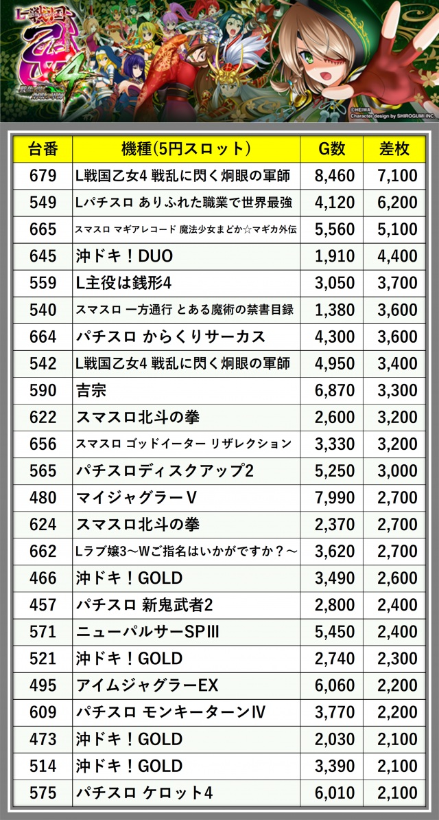 厳選された取材対象機種をはじめ、その他スロット全体から好記録が飛び出した!プレイヤーが楽しんだ1日を下記データにて振り返ってみて欲しい。