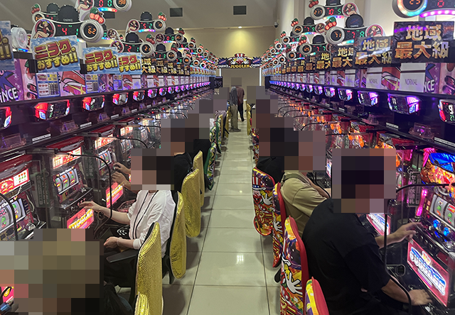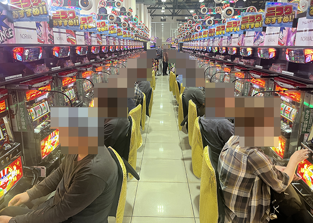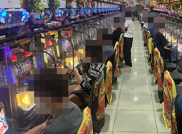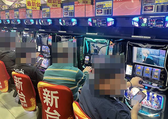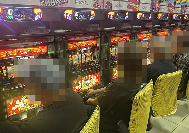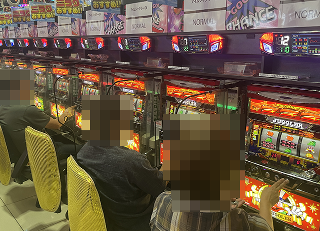 「マイジャグラーⅤ」で遊技をおこなうプレイヤーも表情は明るく、充実した時間を過ごせている様子。