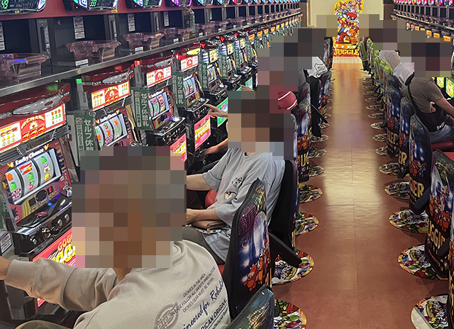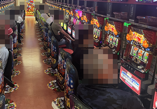 「マイジャグラーⅤ」や「ゴーゴージャグラー3」などが楽しまれており、たくさんのプレイヤーが遊技を満喫している様子であった。