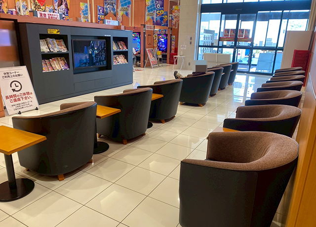 店内には広い休憩コーナーがあり、ソファやテレビなどが完備されている。
