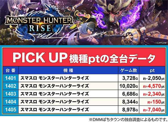 「フジコー三島店」の「スマスロ モンスターハンターライズ」は、5台中4台がプラス。