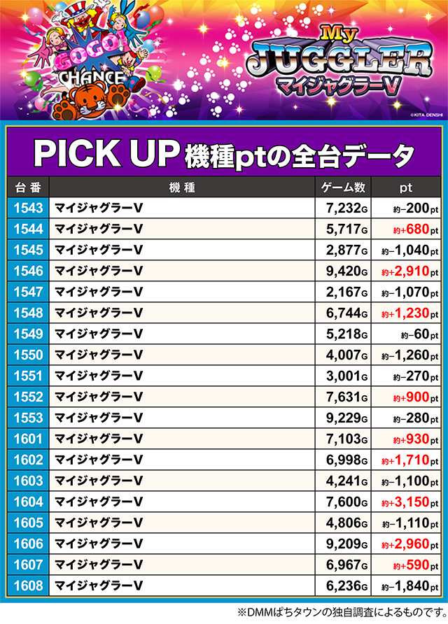 「マイジャグラーⅤ」も9台が結果を残し、3台は約+2,900ptを上回った。