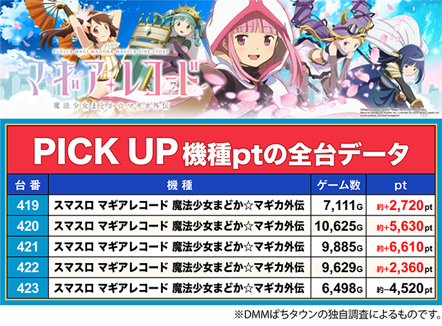 「スマスロ マギアレコード 魔法少女まどか☆マギカ外伝」の421番台と「吉宗」の1036番台も約+6,600pt以上。
