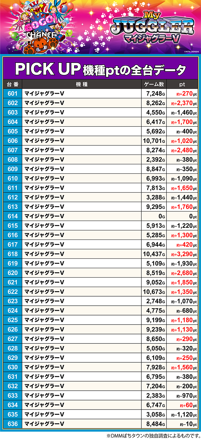 「フジコー御殿場店」の「マイジャグラーⅤ」は、618番台が約+3,200ptオーバー。