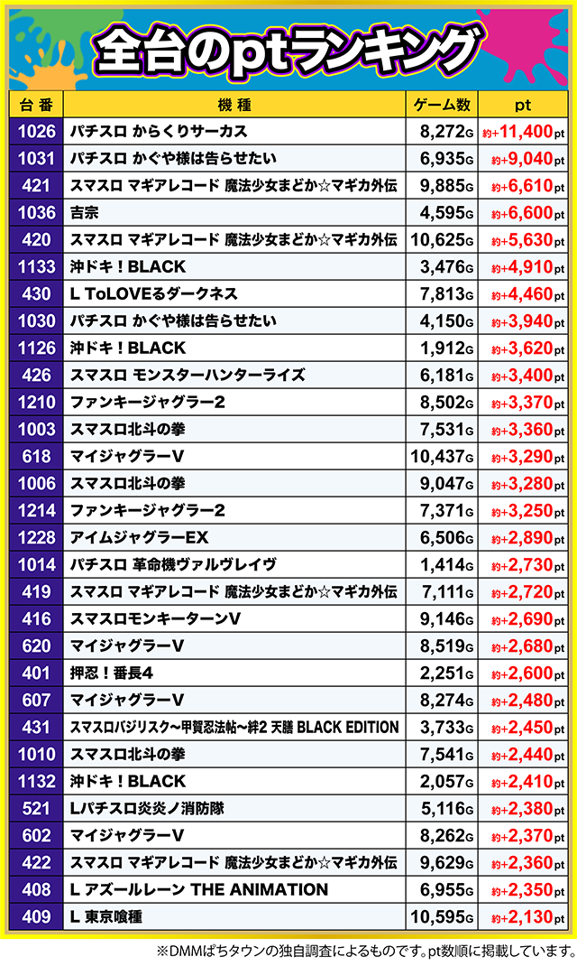 約+1,000ptを超えた台も多数あり、機種全体で5割を超える19台がプラスとなった。