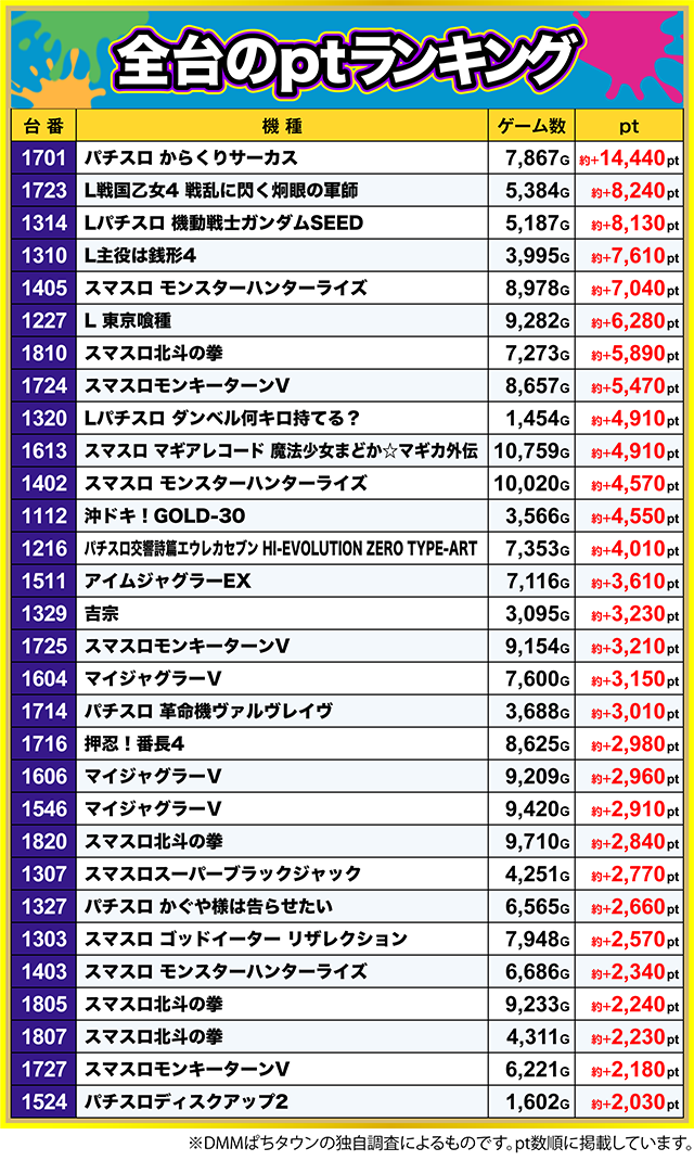 「L戦国乙女4 戦乱に閃く炯眼の軍師」の1723番台と「Lパチスロ 機動戦士ガンダムSEED」の1314番台も約+8,100ptを上回った。