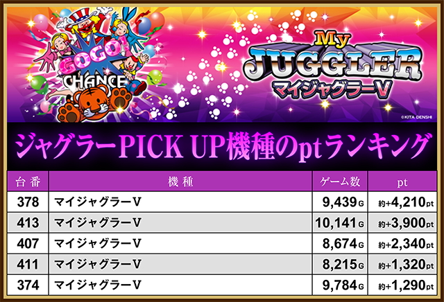 「マイジャグラーⅤ」も5台が約+1,200ptを超え、378番台が約+4,200ptを上回った。