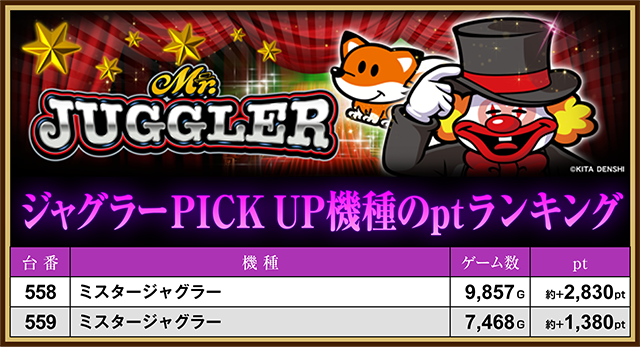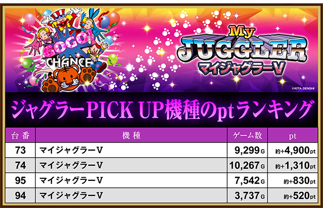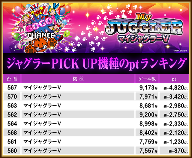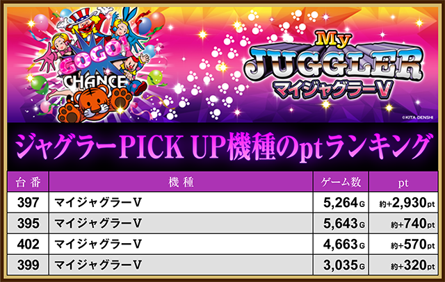 「マイジャグラーⅤ」も7台が約+1,200pt以上で、どちらの機種も複数台が約+3,000ptを上回った。