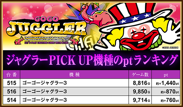 「ゴーゴージャグラー3」や「ミスタージャグラー」、「ハッピージャグラーVⅢ」でも、約+1,300ptを超えた台を確認。