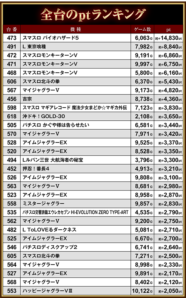 「マイジャグラーⅤ」も7台が約+1,200pt以上で、どちらの機種も複数台が約+3,000ptを上回った。