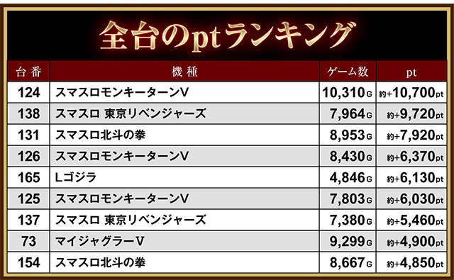 「スマスロ北斗の拳」も2台が約+4,800pt以上となり、約+8,000ptクラスとなった台もあった。