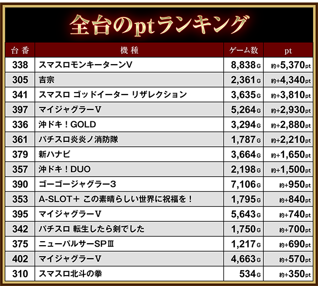 ほかにも、「マイジャグラーⅤ」の397番台や「沖ドキ!GOLD」の336番台などが約+2,200pt以上となった。
