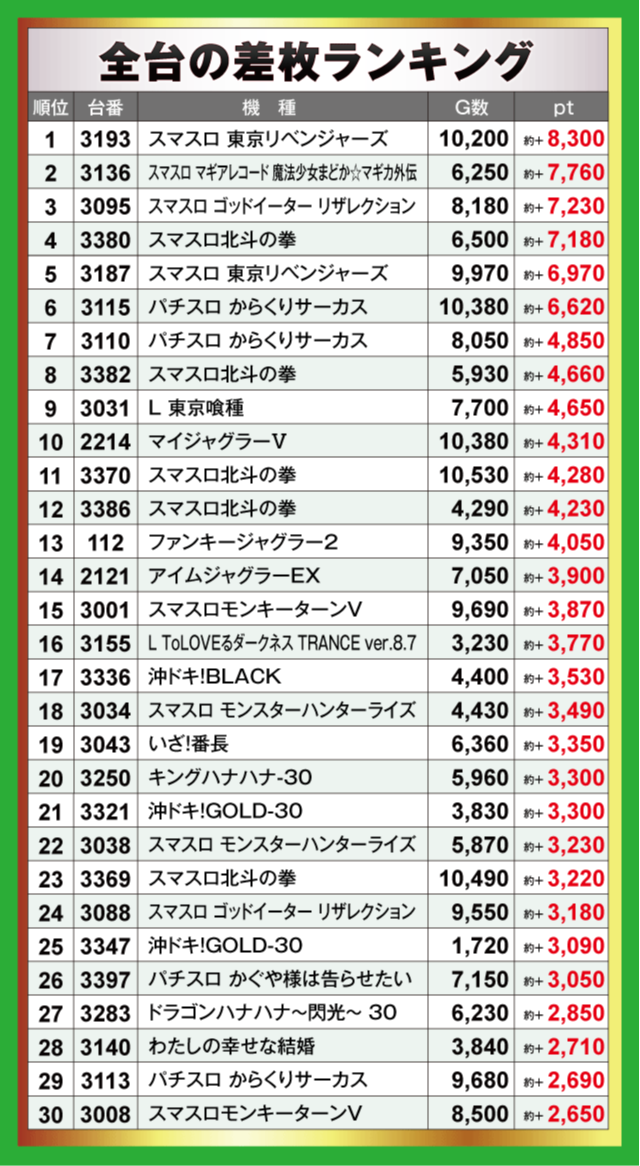 また、その他にも『スマスロ マギアレコード 魔法少女まどか☆マギカ外伝』と『スマスロ ゴッドイーター リザレクション』、さらには『スマスロ北斗の拳』が+7,000pt超を記録するなど、人気のスマスロを中心に好成績が続出している。