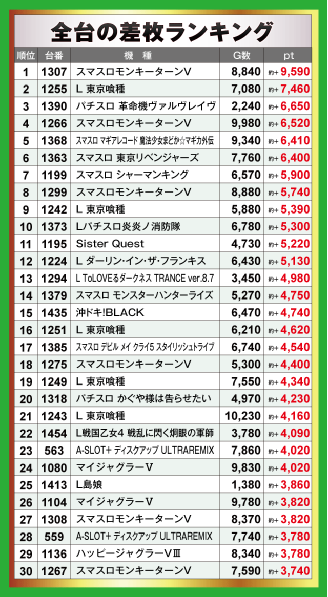 また、その他にも『パチスロ 革命機ヴァルヴレイヴ』や『スマスロ 東京リベンジャーズ』を筆頭にありとあらゆる機種から+6,000pt超、+5,000pt超が大量発生。新旧を問わず人気のスマスロを中心に広範囲に渡ってチャンスが潜んでいたのは間違いないだろう。