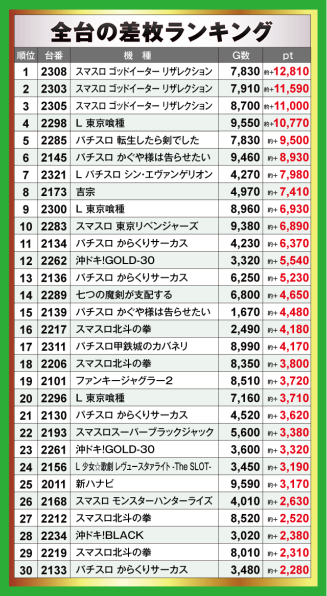 各店の全台差枚ランキング