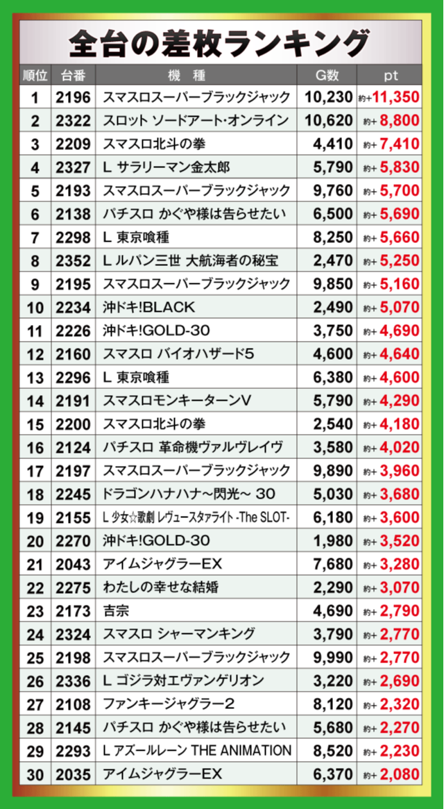 楽園沼津店では、『スマスロスーパーブラックジャック』が+11,000pt超に+5,000pt超が2台とハイスコアを連発。また、『L アズールレーン THE ANIMATION』からも+2,000pt超が発生している。