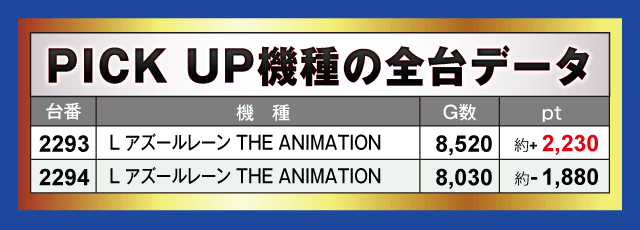 楽園沼津店では、『スマスロスーパーブラックジャック』が+11,000pt超に+5,000pt超が2台とハイスコアを連発。また、『L アズールレーン THE ANIMATION』からも+2,000pt超が発生している。