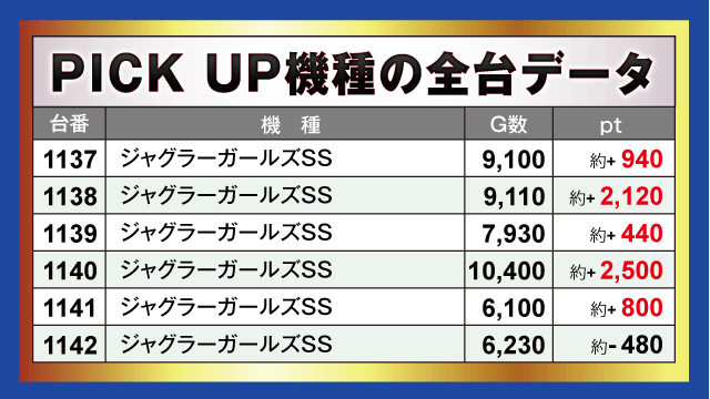 楽園浜松ザザシティ店はジャグラーシリーズをPICK UP。『マイジャグラーⅤ』から+4,000pt超、『ジャグラーガールズSS』からは+2,000ptが2台発生。しかも、両機種合わせた全34台中23台がプラス差枚となった。