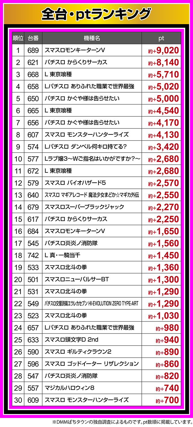 『スマスロ モンスターハンターライズ』の607番台は約+4,130pt、『Lパチスロ ダンベル何キロ持てる?』の574番台も約+3,420ptと、いくつもの台が結果を残した。