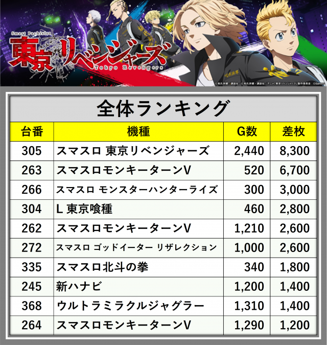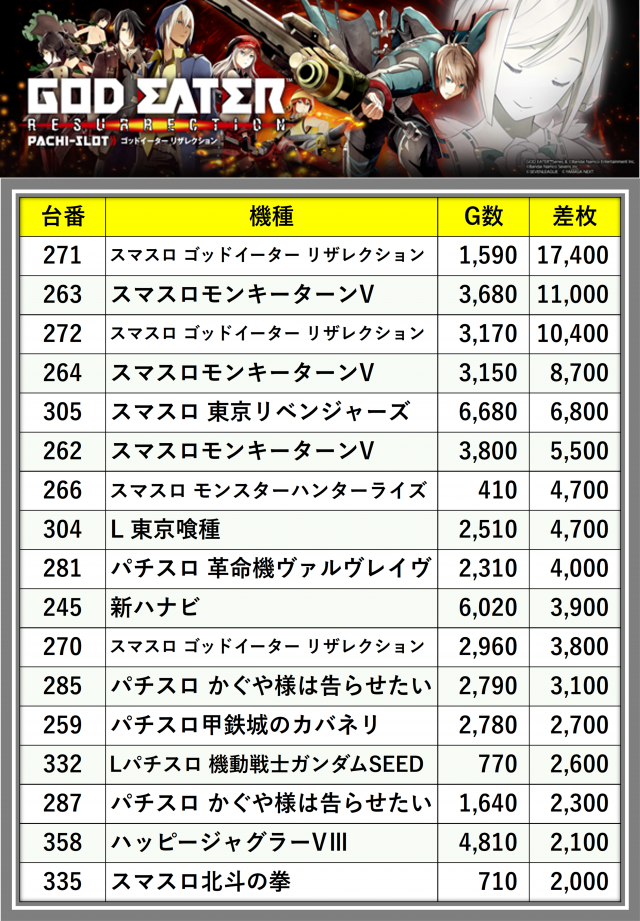 ※差枚数順に掲載しています