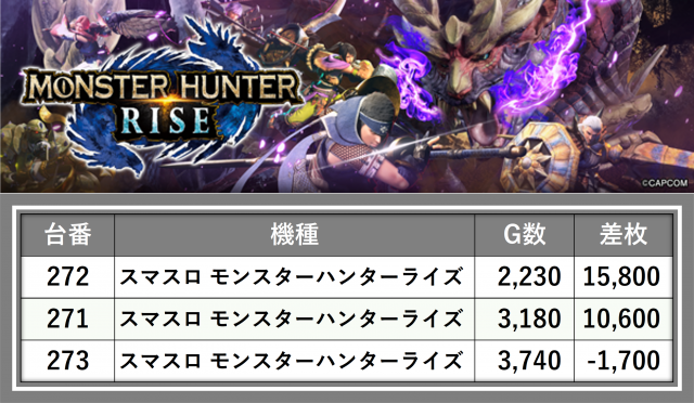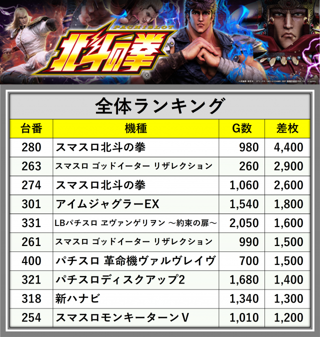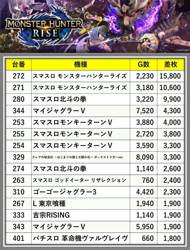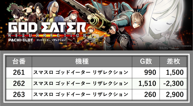 厳選された取材対象機種をはじめ、その他スロット全体から好記録が飛び出した!プレイヤーが楽しんだ1日を下記データにて振り返ってみて欲しい。