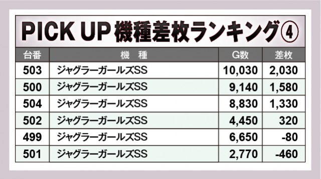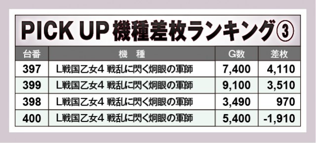 『L 東京喰種』『スマスロ ゴッドイーター リザレクション』から大台突破台が飛び出しており、さらに半数以上でプラス差枚数を築いているのが目に焼きつく。『L戦国乙女4 戦乱に閃く炯眼の軍師』『ジャグラーガールズSS』も同様で、回転数の多さからも、ファンが好感触を手にしていた様子がハッキリと窺えるだろう。万回転OVERのように明らかな数字も見られ、有意義な時間を過ごしていたのは間違いない。