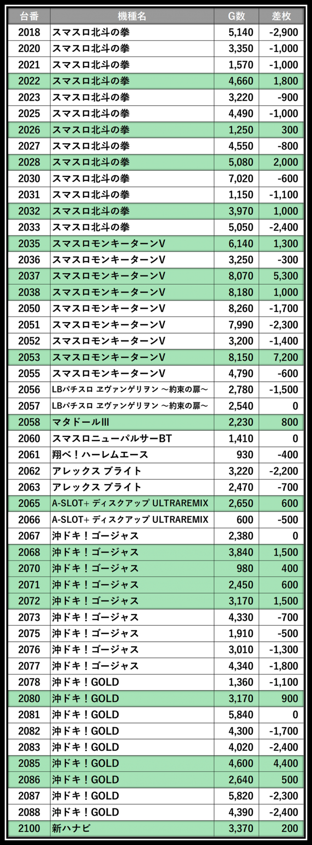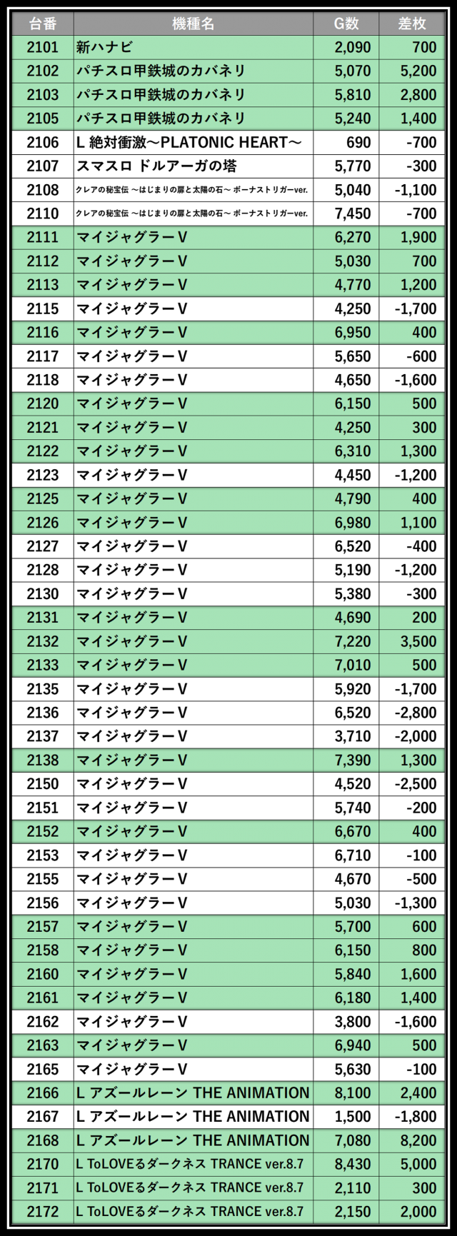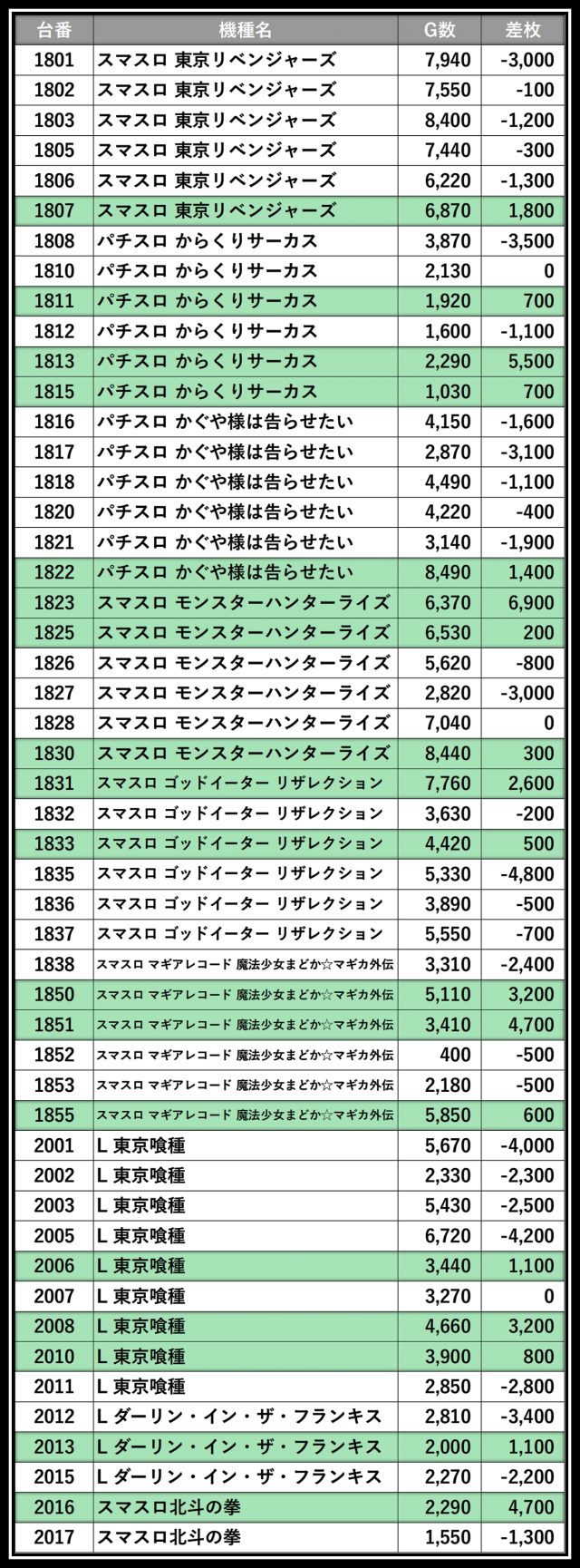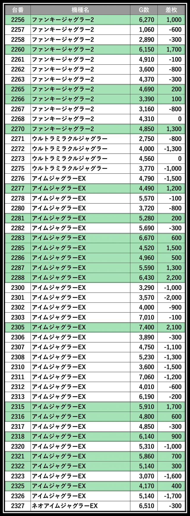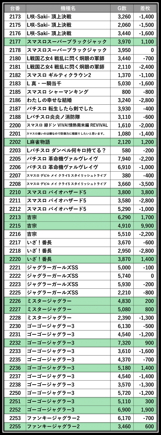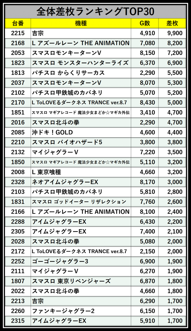 ※差枚数順に掲載しています