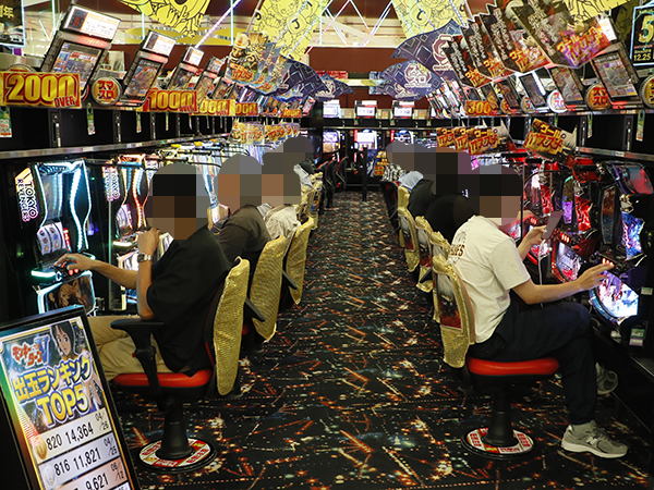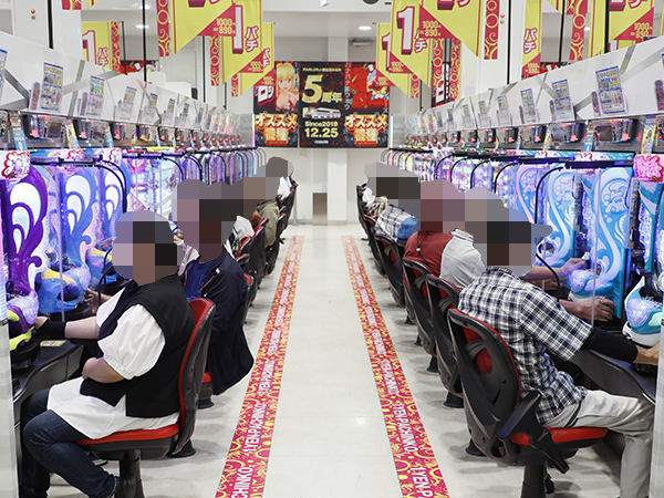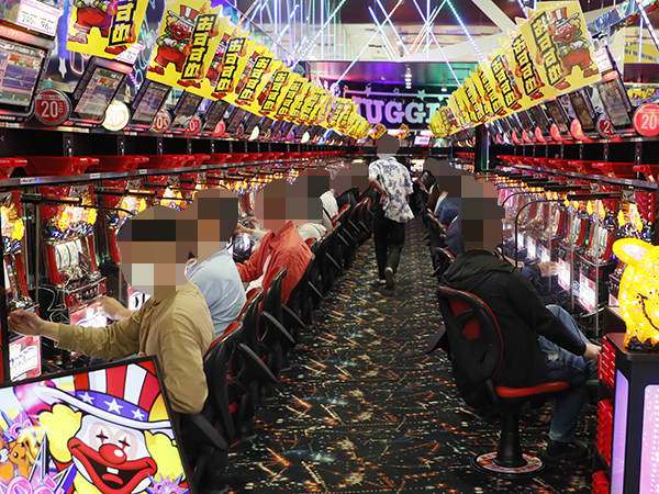 取材時は多くのプレイヤーが来店。パチンコ・パチスロともに、様々な機種が支持を得ていた。