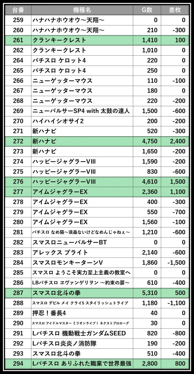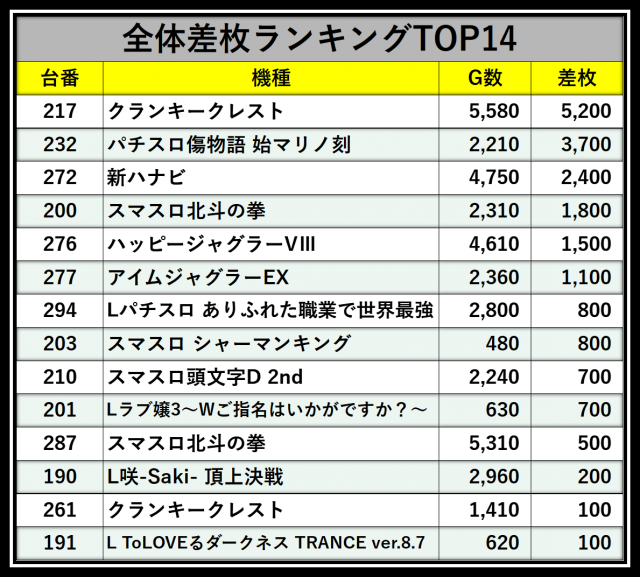 ※差枚数順に掲載しています