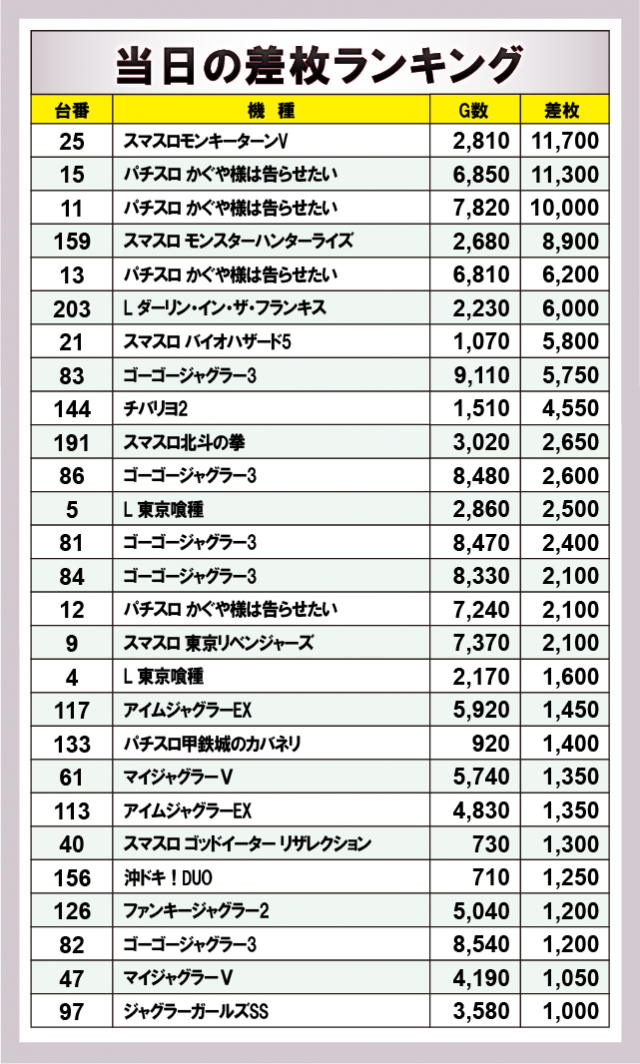 2台の万枚OVER台がうまれた『パチスロかぐや様は告らせたい』を筆頭に、各機種から際立った好成績が確認できた。特に『ゴーゴージャグラー3』は好調台が並び、高稼働かつ高勝率という状況を実現。ほかの台も軒並みプラス差枚を刻み、同機種のポテンシャルをしっかりとアピールしていた!