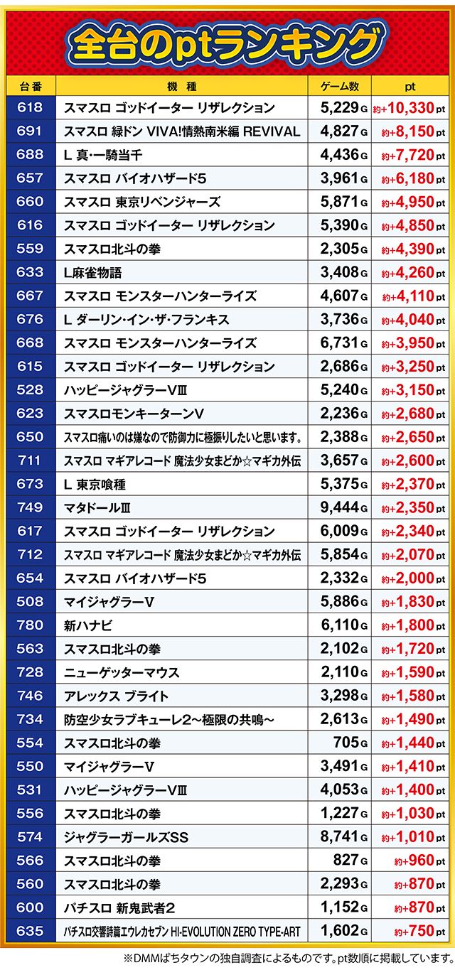 4台が約+2,300pt以上で、618番台は約+10,330ptを記録した。