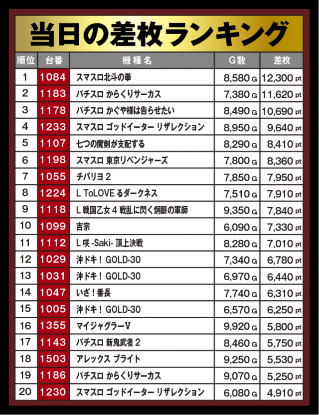 この日のSAPグループはひと味違う。DMMぱちタウンは、「SAP草加店」の特別なひとときを一斉取材した。特に華々しい活躍を残した機種たちをピックアップして紹介しよう。まずは差枚ランキングの発表だ!