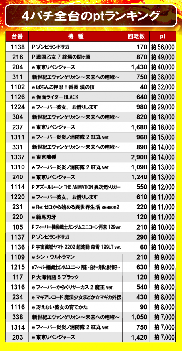 今回パチンココーナーでトップを飾ったのが『Pゾンビランドサガ』で、約56,000ptを記録し大きな盛り上がりを披露!それに続き『P戦国乙女7 終焉の関ヶ原』『e東京リベンジャーズ』から約40,000ptOVERをマークするなど、高い活気と熱気を放っていた!