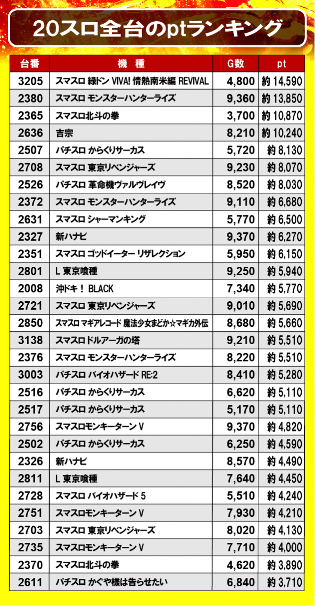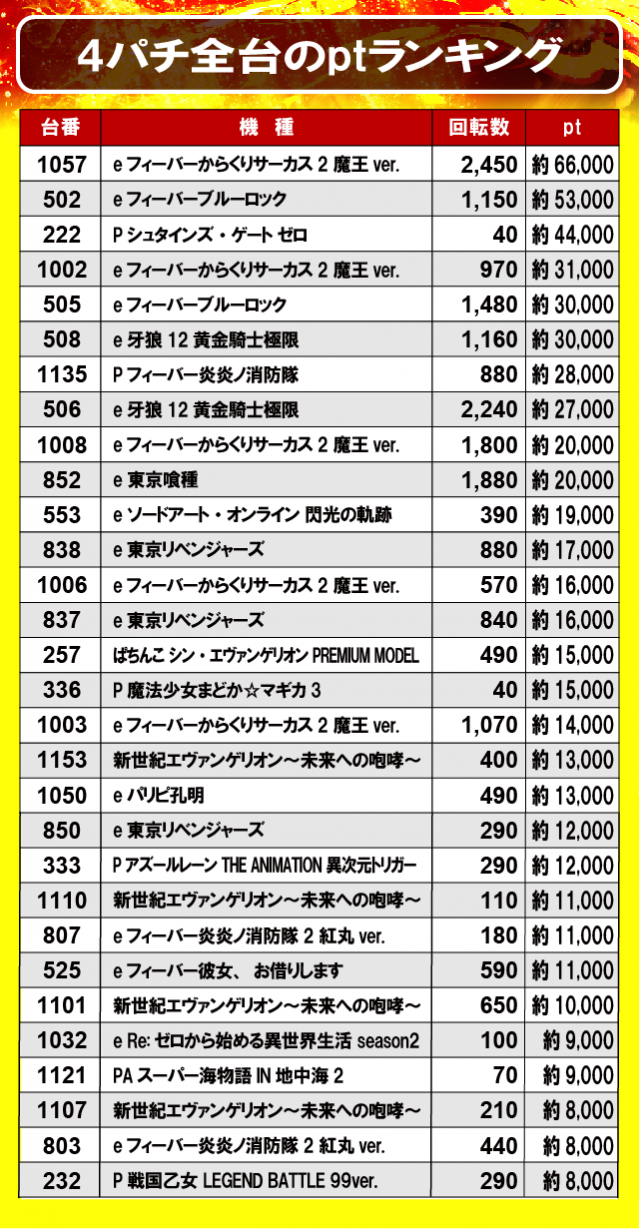 パチンココーナーもスロット同様に幅広い機種が名を連ねているのが印象的な結果となっており、TOPは『eフィーバーからくりサーカス2 魔王ver.』から約66,000ptをマーク!次点が新台の『eフィーバーブルーロック』から約53,000ptを記録!その他にも様々な機種の名前が並んでいるがどれもまとまった出玉を獲得しており、どこからでもチャンスがあったことが窺える!