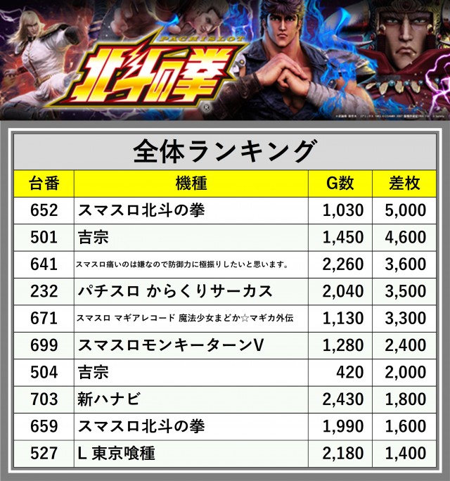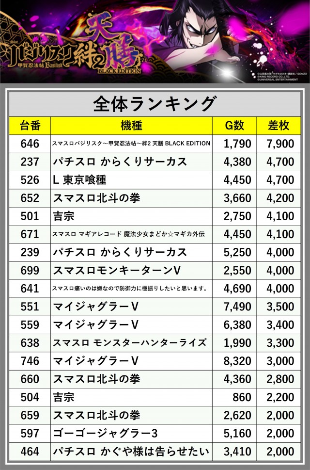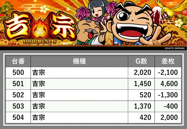 厳選された取材対象機種をはじめ、その他スロット全体から好記録が飛び出した!プレイヤーが楽しんだ1日を下記データにて振り返ってみて欲しい。