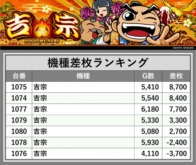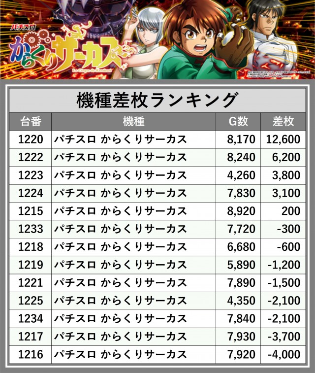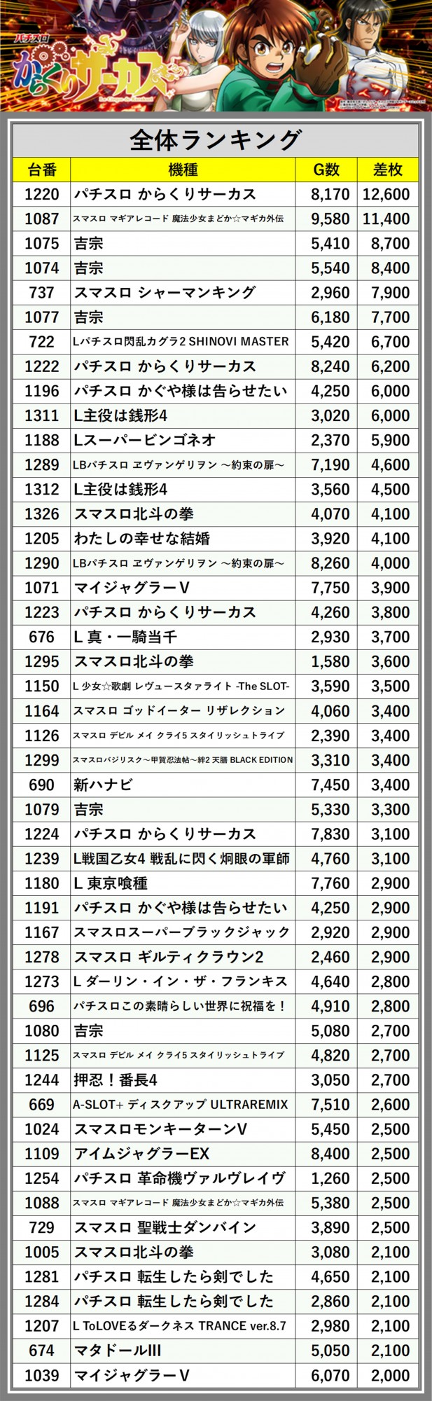 ※差枚数順に掲載しています