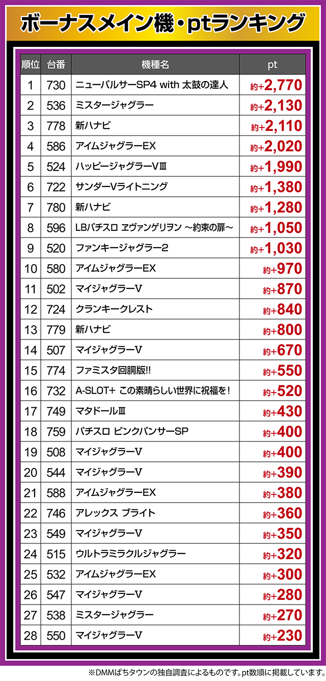 『サンダーVライトニング』の722番台や『LBパチスロ ヱヴァンゲリヲン ~約束の扉~』の596番台、『ファンキージャグラー2』の520台番台なども約+1,000ptオーバー。