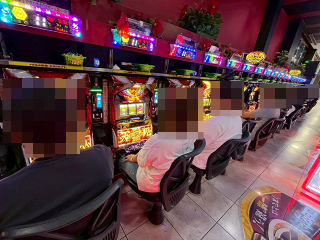 『パチスロ かぐや様は告らせたい』や『スマスロスーパーブラックジャック』などに楽しげなプレイヤーがおり、パチスロ全体が明るい雰囲気となっていた。